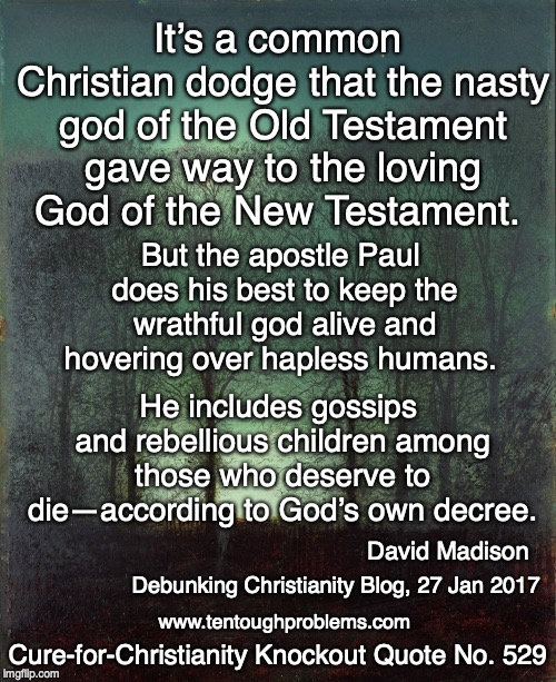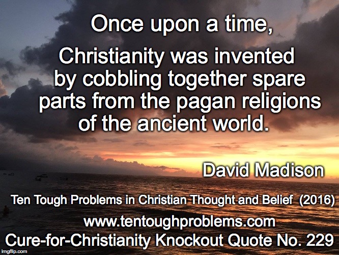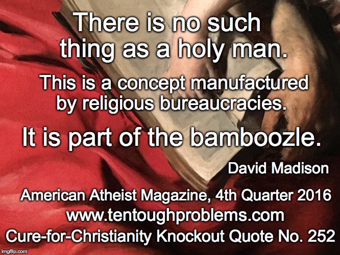 Madison, Why isn’t membership in the Catholic Church down to ZERO by now?Knockout Quote No 547, Madison, We sure hope God savors all that glory!Madison, There was no cleansing of the templeCCKQ No 529, Madison, The apostle Paul does his best to keep the wrathful god alive and hovering over hapless humansKnockout Quote No 402, Madison, A world religion is a cult that grabbed major market shareKnockout Quote No 523, Madison, How can a good God, devoid of imperfections, be needy and narcissistic?Knockout Quote No 511, Madison, If only Christians could read the gospels and wise up that they’ve been conned