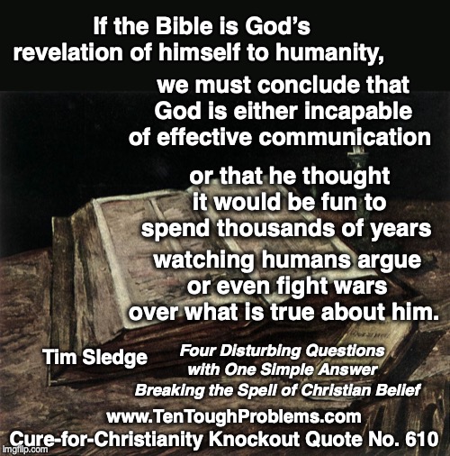 CCKQ No 534, Sledge, The same evangelical Christians who rely on centuries-old accounts of the post-resurrection appearancesCCKQ No 587, Sledge, I felt as if a heavy weight had been lifted off my shouldersCCKQ No 593, Sledge, What lies down the steps is a basement with nothing in itCCKQ No 595, Sledge, Why didn’t the God of the universe—walking among mankind in the flesh as Jesus—do a sidebar talk on germs?CCKQ No 596, Sledge, Jesus was a Jewish apocalyptic prophet who is now deceasedCCKQ No 597, Sledge, Have you ever met anyone who told you they started reading the Bible and couldn’t put it down?CCKQ No 598 Sledge, It’s an Edward Scissorhands approach to the BibleCCKQ No 599, Sledge, The biblical story of man’s sinfulness and God’s plan redemption doesn’t add up because it’s made upCCKQ No 608, Sledge, What if, right now, I could swallow a pill that would bring my old faith back?CCKQ No 610, Sledge, We must conclude that God is either incapable of effective communicationTin Sledge, The evangelical mental guardrails installed in my headCCKQ No 533, Sledge, Where is the gentleness in the words of Jesus when he speaks of wrathCCKQ No 532, Sledge, I also felt a lightness that I had not felt as a Christian ministerCCKQ No 531, Sledge, Yes, I knew Jesus quite well, but he never mentioned anything about being born againCCKQ No 530, Sledge, How could I keep my eyes closed for decades to such evident fatal flaws in my faith?CCKQ No 525, Sledge, When it comes to religion, perception is more influential than realityTim Sledge, My reasoning was constrained by a very short leash