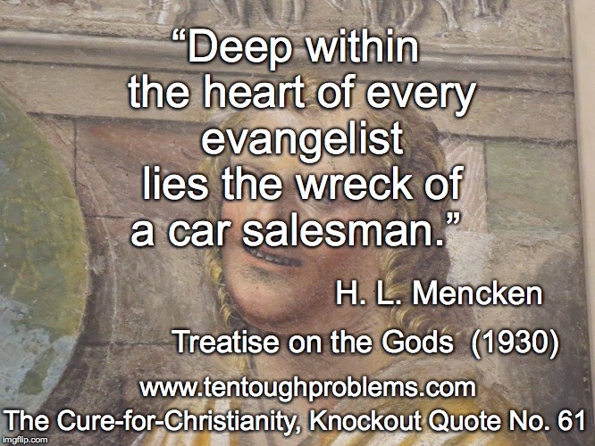 Knockout Quote No 61, Mencken, Deep within the heart of every evangelistKnockout Quote No 167, Mencken, Christianity is full of vestiges of the barbaric cults that entered into itKnockout Quote No 95, Mencken, Religion is opposed to everything I hold in veneration